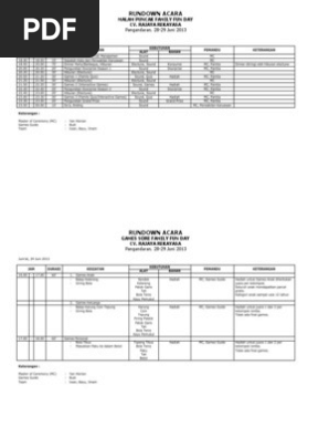 Demikianlah susunan pengenai rundown acara seminar yang bisa kalian dapatkan pembahasan ini bisa berubah ubah sesuai dengan baimana acara pelaksanaan seminar. Rajaya rekayasa pangandaran 28 29 juni 2013 jumat 29 juni 2013 jam 1830 1840 1850 2000 2020 2050 2120 2150 2220 2240 2300 2330 2350 1840 1850 2000 2020 2050 2120 2150 2220 2240 2300 2330 2350 0000 durasi 10 10 70 20 30 30 30 30 20 20 30 20 10 kegiatan sepatah kata dari pihak manajemen sepatah kata dari perwakilan. Contoh rundown acara halo sobat kali ini penulis akan membagikan artikel yang mengenai tentang contoh rundown acara artikel ini tentu akan hadir dengan membagikan berbagai informasi dan berbagai ilmu pengetahuan baru yang meliputi pengertian rundown acara cara membuat roundown acara dan contoh rundown acara yang pembahasannya akan penulis berikan untuk kalian semua berikut ini. Family gathering lembang adalah salah satu kegiatan rutinitas yang biasanya menjadi program tahunan dari setiap perusahaan. Contoh acara gathering 2 hari 1 malam. Games gathering terbaik saat kumpul bersama keluarga atau mengadakan acara di kantor pasti membutuhkan beragam kegiatan agar suasana menjadi semakin riuh dan seru karena momen tersebut sulit terjadi.