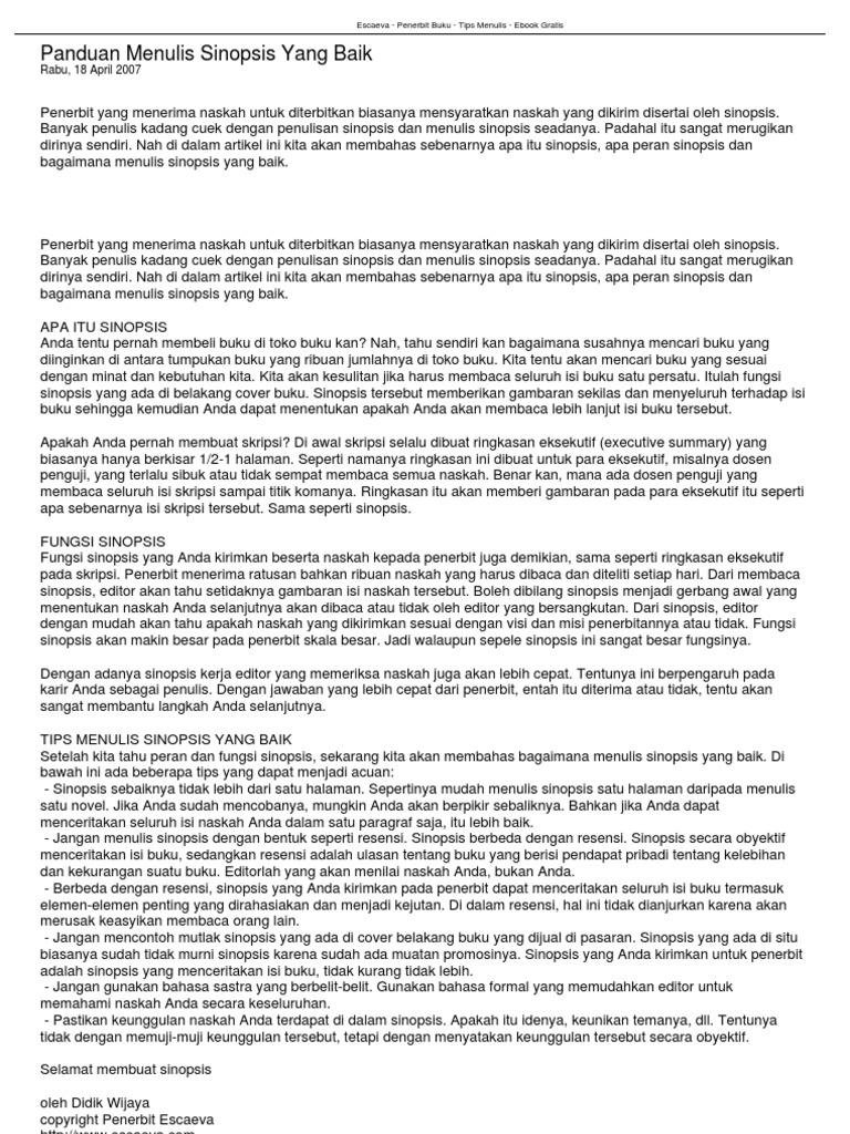 Tapi tiap kelebihan tentu ada kelemahan bab bab di atas nantinya akan terjadi banyak perubahan atau biasa disebut revisi ketika penelitian berjalan. Cara menulis sinposis yang baik sudah merupakan kebiasaan dan pengetahuan penting yang harus dimiliki oleh seorang penulispenulis sebelum menerbitkan bukunya akan dimintai oleh penerbit untuk melampirkan sinopsis dari buku yang dibuat baik itu berupa buku fiksi maupun buku buku ilmiah. Berbeda dengan ringkasan biasa yang hanya memberi tinjauan umum sebuah cerita sinopsis memasukkan semua detail alur. 845sinopsis juga dapat diartikan sebagai ringkasan cerita dari suatu tulisan tertentu baik fiksi maupun nonfiksi. Sinopsis novel laskar pelangi. Sinopsis novel laskar pelangi ini tak akan bernilai manfaat apa apa kecuali kawan kawan mau belajar untuk mandiri dan bersungguh sungguh ketika mencapai cita cita.