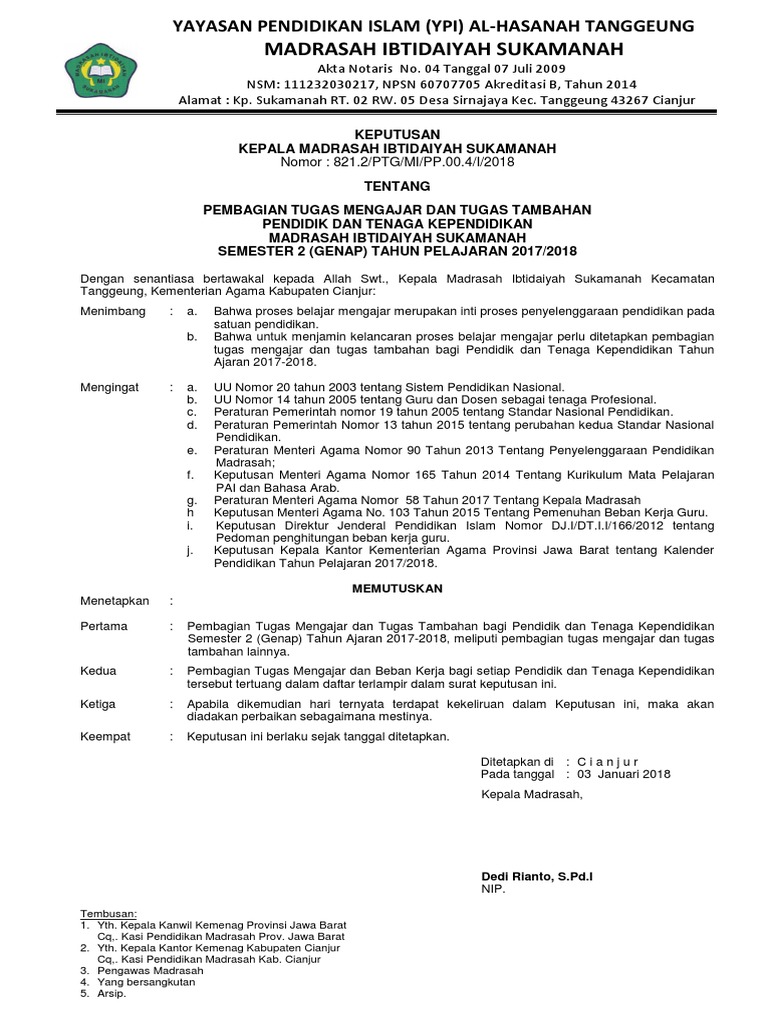 Sk pembagian tugas mengajar dan tugas tambahan guru untuk sd ini telah menggunakan permeneg pan no 16 tahun 2009 tentang jabatan fungsional guru dan angka kreditnya sebagai dasar hukum. Contoh sk pembagian tugas mengajar 20192020 terbaru sk yang akan dibagikan kali ini merupakan sebuah surat keputusan tugas mengajar buat guru saat akan melaksanakan kegiatan awal masuk sekolahbagi guru memang sangat disarankan untuk membuat sk pembagian tugas mengajar disaat awal ajaran baru atau semsester 1 dan awal semester 2. Fungsi sk pembagian tugas. Berikut ini contoh sk pembagian tugas mengajar 20192020 di tkpaud sdmi smpmts smasmkma dilengkapi lampiran. Jadi anda tidak perlu khawatir mendownload dan menggunakan file file ini di perangkat komputer anda. Format contoh sk pembagian tugas mengajar terbaru 20192020 ini berbentuk word dan excel sehingga memudahkan dalam pengeditan atau perubahan edentitas sesuai dengan kondisi sekolah masing masing.