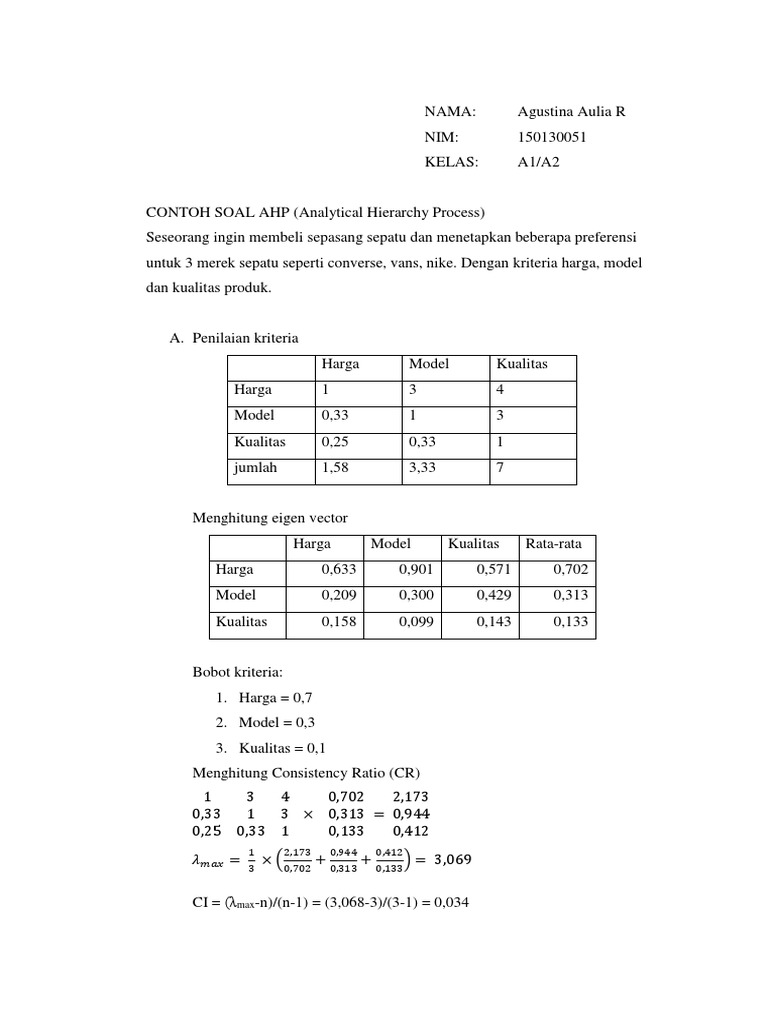 Contoh soal ahp dan penyelesaiannya. Metode pairwise comparison ahp mempunyai kemampuan untuk memecahkan masalah yang diteliti multi obyek dan multi kriteria yang berdasar pada perbandingan preferensi dari tiap elemen dalam hierarkijadi model ini merupakan model yang komperehensif. Contoh kasus ahp pemilihan tas wanita dengan 3 kriteria yaitu. Ahp beserta contoh dan penyelesaian. Metode ahp dikembangkan oleh thomas l. Kemungkinan anda sudah pernah mendengar ahp atau analytic hierarchy process. Harga merk model.