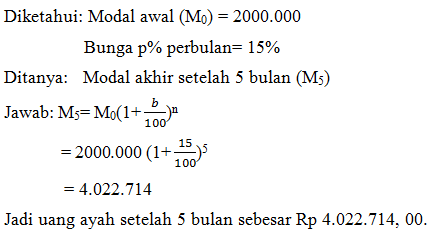 Contoh soal bunga majemuk dan pembahasannya matematika. Modal sebesar rp1000000000 dipinjamkan dengan bunga majemuk 2 per tahun. Silahkan simak contoh soalnya dan jika ada masalah silahkan tanyakan di kolom komentar. Contoh soal 1 pak burhan meminjamkan modalnya sebesar rp 1500000000 dan harus dikembalikan dalam jangka waktu 5 tahun. Pada permulaan tahun ketiga modal itu menjadi. Materi bunga tunggal lebih sederhana dalam materi pada bunga majemuk. Pembahasan lebih mendalam tentang teori ini sudah kita bahas dalam artikel saya tentang bunga majemuk.