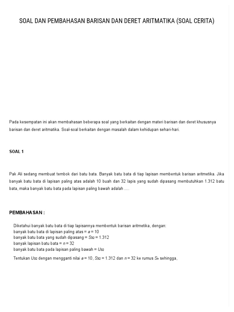 Contoh soal cerita barisan dan deret aritmatika dan penyelesaiannya. 2 10 18 26 34 42 dan seterus nya. Pembahasan mata pelajaran matematika kali ini akan mengupas persoalan mengenai barisan dan deret aritmatika. Soal cerita dan pembahasan barisan dan deret aritmatikapada kesempatan ini id ku membahas tentang soal cerita barisan dan deret aritmatika dalam kehidupan sehari hari. Barisan dan deret aritmatika rumus suku ke n barisan aritmatika. Kumpulan soal soal di bawah ini merupakan kumpulan soal dari ujian nasional soal ebtanas dan lain lain. Soal dan pembahasan aplikasi soal cerita barisan dan deret aritmetika today quote 2get and 2give create many problems.