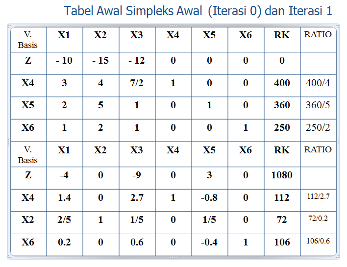 Contoh soal cerita metode simpleks maksimum 3 variabel. Sistem persamaan linear 3 variabel merupakan himpunan 3 buah persamaan dengan variabel sebanyak 3. Pada contoh di atas metode simpleks diterapkan pada masalah maksimasi. Feasibility condition adalah sama untuk kedua masalah. Pada masalah minimasi optimally condition berubah di mana entering variabel dipilih dari variabel yang memiliki koefisien positif terbesar pada persamaan z. Admin dari blog bagikan contoh 2019 juga mengumpulkan gambar gambar lainnya terkait contoh soal cerita metode simpleks maksimum 3 variabel dibawah ini. Tabel sudah minimum jika semua nilai dari zj cj 0.