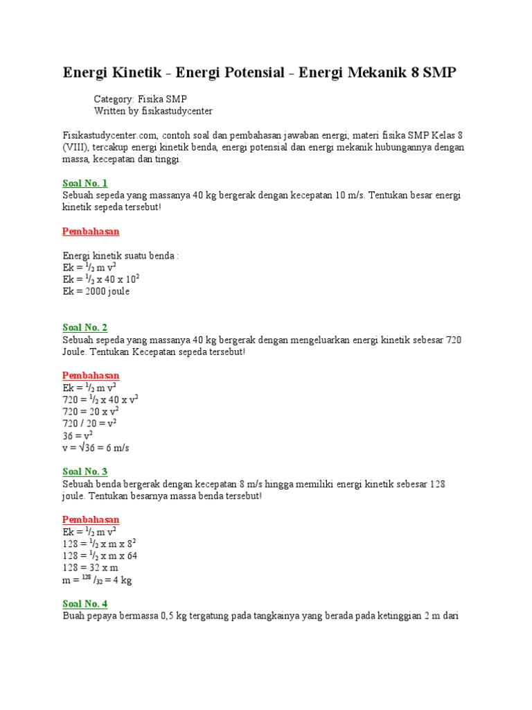 Pembahasan soal materi fisika kali ini akan membicarakan topik tentang latihan soal energi potensial dan dan juga latihan soal energi kinetik. Berbagai jenis energi bisa dikelompokkan sebagai energi potensial.