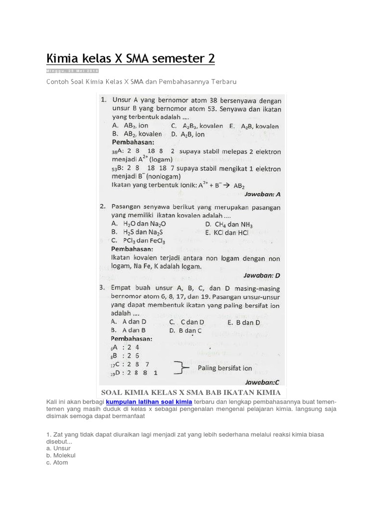Pasangan unsur yang da. Soal kimia kelas 10. Soal soal tentang ikatan kimia dan jawabannya. Perhatikan keterangan di bawah. Materi ilmu kimia adalah sebuah cabang ilmu fisika yang mempelajari tentang struktur dan komposisi atau perubahan dari zat yang akan di rumah menjadi barang senyawa. Materi sebelumnya 5 contoh soal kimia kelas 10 tentang ikatan ion beserta.
