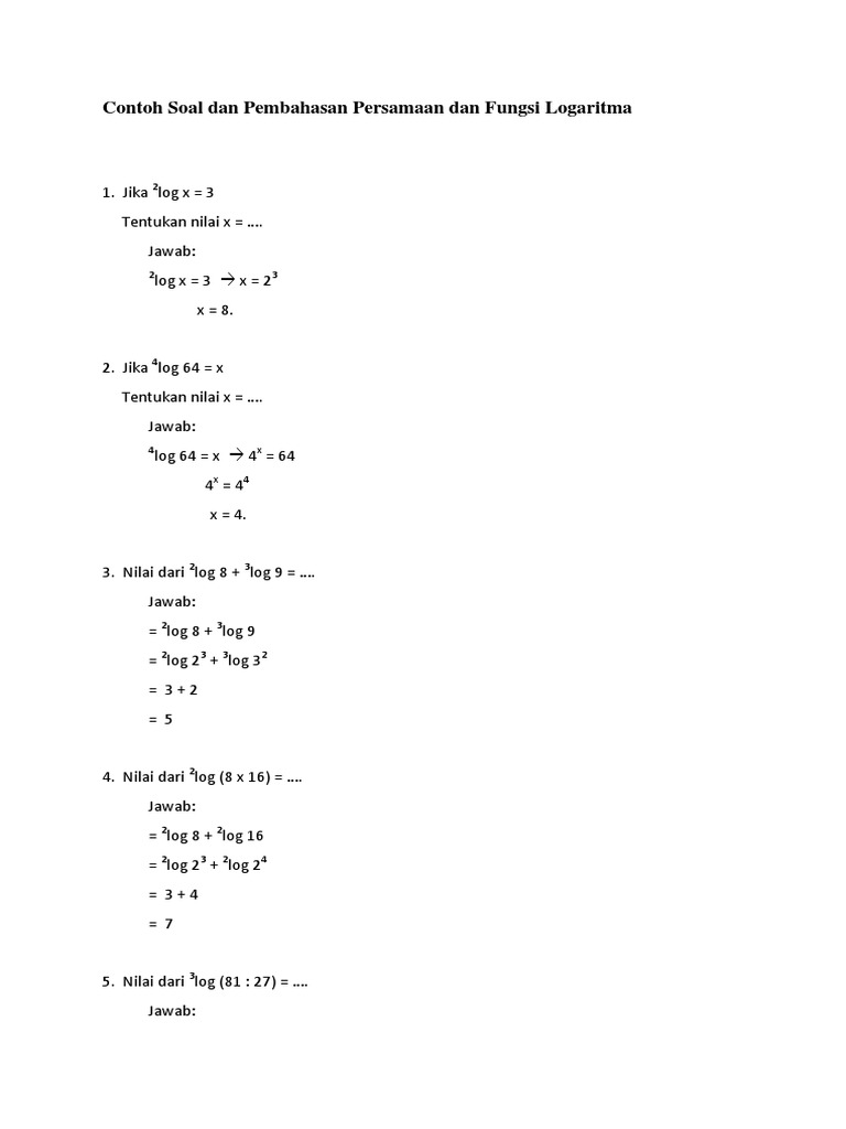 3 log 245 ½ 3 log 5 ½ x 49 ½ 3 log 245 ½ 3 log 5 ½ 3 log 7 2 ½. Pada pertemuan sebelumnya telah dibahas tentang pengertian persamaan logaritma dimana diartikel sebelumnya diuraikan lengkap mulai dari pengertian sifat rumus dan beberapa contoh soal namun tidak banyak.