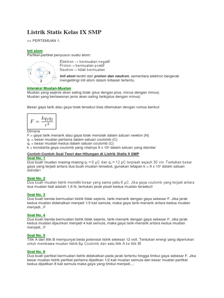 1 dua buah muatan masing masing q 1 6 μc dan q 2 12 μc terpisah sejauh 30 cm. Hukum coulomb ditemukan oleh charles agustin de coulomb seorang fisikawan berkebangsaan perancis pada tahun 1785. Contoh contoh soal teori dan hitungan di listrik statis 9 smp soal no. Contoh soal listrik statis dan hukum coulomb ini disusun dalam bentuk pilihan berganda dilengkapi dengan pembahasan dan dirancang sedemikian berdasarkan beberapa subtopik yang paling sering keluar dalam kajian listrik statis dan hukum coulomb untuk tingkat menengah pertama. Menentukan pengaruh jarak terhadap gaya listrik menentukan besar dan arah gaya coulomb dan menentukan perbandingan gaya coulomb dari dua kondisi berbeda. Pembahasan data dari soal.