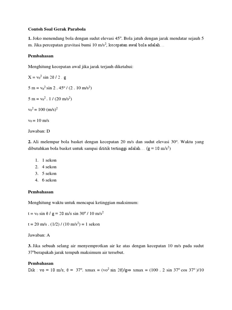 Nah bagi sahabat yang masih belum mengerti silakan dibaca terlebih dahulu penjelasan dan rumus rumusnya di materi gerak parabola. Gerak parabola adalah gerak benda yang mempunyai lintasan berbentuk parabola. Pelajaran ini termasuk cukup menarik serta membutuhkan analisa yang cukup mendalam. Gerak parabola sendiri merupakan salah satu sub pembahasan dalam pelajaran fisika sma kelas 10. Contoh 1 sebuah bola ditendang dengan sudut elevasi 37 dan kecepatan awal 10 ms.