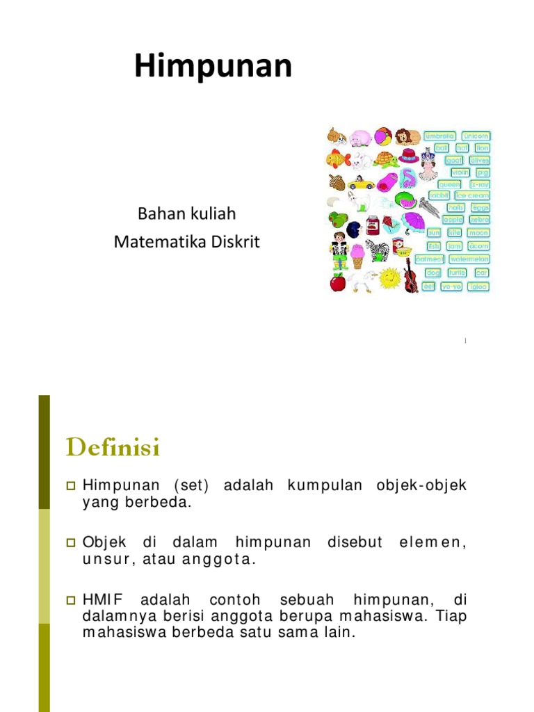 Walaupun hal ini merupakan ide yang sederhana tidak salah jika himpunan merupakan salah satu konsep penting dan mendasar dalam matematika modern dan karenanya studi mengenai struktur kemungkinan. 3 9 12 2. Dari soal di atas himpunan kelipatan 3 yang terdapat di p adalah 3912. Walaupun hal ini sangat sederhana tidak salah jika himpunan merupakan salah satu konsep penting dan mendasar dalam matematika modern dan oleh karena itu himpunan sangatlah berguna dalam kehidupan sehari hari. X adalah mahasiswa yang mengambil kuliah matematika diskrit cara penyajian himpunan. Penggunaan himpunan dalam matematika dimulai pada akhir abad ke 19.