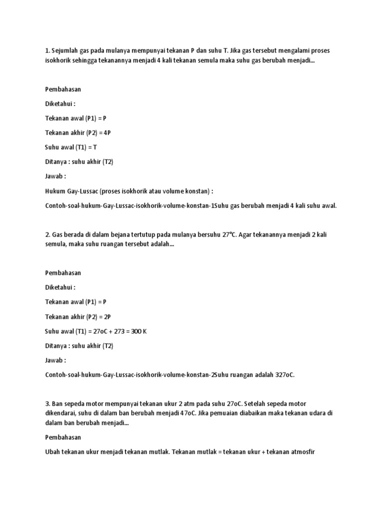 Contoh soal hukum gay lussac. Namun yang menjadi pertanyaannya sekarang adalah mengapa perbandingan volume gas gas dalam suatu reaksi merupakan bilangan sederhana. Teori tersebut dikenal sebagai hukum avogadro. Contoh soal hukum gay lussac pada gas ideal pada awal perjalanan ban mobil mempunyai tekanan 275 atm dan suhu 27 c. Jika gas tersebut mengalami proses isokhorik sehingga tekanannya menjadi 4 kali tekanan semula maka suhu gas berubah menjadi. Jika tekanan udara luar 1 atm dan pemuaian diabaikan. Contoh soal hukum gay lussac isokhorikvolume konstan 1.
