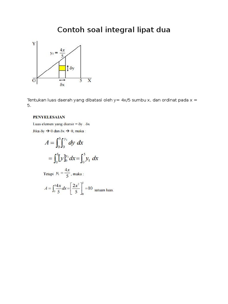 Menentukan luas daerah yang terletak dibatasi kurva y fx dan sumbu x. Menentukan luas daerah yang terletak di antara dua kurva. Integral merupakan cabang ilmu matematika yang memiliki tingkat kesulitan cukup tinggi. Yaitu untuk menentukan luas suatu daerah dan volume benda putar jika suatu daerah diputar mengelilingi sumbu tertentu. Integral merupakan bentuk pada operasi matematika yang menjadi kebalikan atau disebut invers dari operasi turunan dan limit dari jumlah ataupun suatu luas daerah tertentu. Contoh soal tabel distribusi frekuensi dan pembahasanya 2823 contoh soal kombinasi dan pembahasan 2727 pembahasan soal utbk 2019 tps kemampuan penalaran 2464 contoh soal sudut sehadap berseberangan sepihak 2277 contoh soal luas segitiga trigonometri dan penyelesaiannya 1987 contoh soal torsi dan penyelesaiannya 1719.