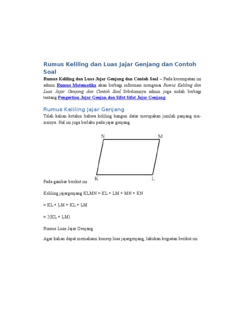 Rumus jajar genjang menghitung luas keliling dan contoh soal pengertian bangun ruang jajar genjang adalah salah satu dari beberapa bangun datar. Jajar genjang adalah segiempat dengan 2 pasang sisi sejajar dan sama panjang serta sudut yang berhadapan sama besar. Luas i alas x tinggi. Rumus luas jajar genjang. Pada artikel sebelumnya kita sudah sama sama belajar bagaimana menghitung keliling serta luas jajar genjang. Sedangkan untuk rumus keliling jajar genjang ialah.