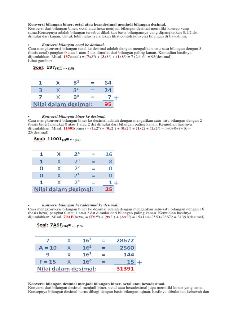 Ikhsanudin 1konversi bilangan biner ke desimal cara mengkonversi bilangan biner ke desimal adalah dengan cara mengalikan satu persatu bilangan dengan 2 basis bilangan biner pangkat 0 pangkat 1 dan seterusnya sesuai dengan banyaknya bilangan biner yang akan di konversi dan perhitungannya dimulai dari bilangan biner yang paling kanan. Pengertian pecahan konversi pembulatan pembagian perkalian soal. Contoh soal konversi bilangan dan jawabannya. Konversi bilangan adalah suatu proses dimana satu system bilangan dengan basis tertentu akan dijadikan bilangan dengan basis yang lain. Konversi dari bilangan desimal ke biner yaitu dengan cara membagi bilangan desimal dengan dua kemudian diambil sisa pembagiannya. Dalam menghitung basis biner ke desimal menggunakan penjumlahan 2 pangkat sekian.