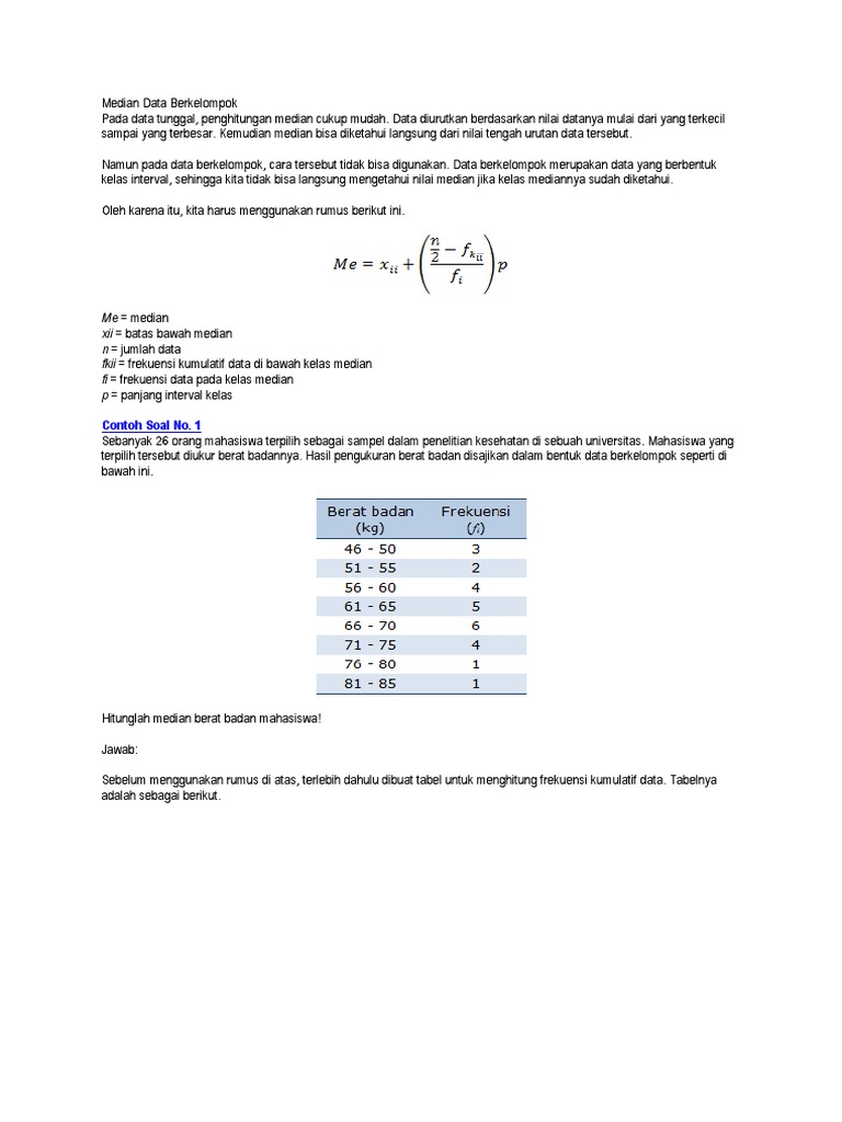 Contoh soal median data tunggal. Kamu akan diajak untuk memahami materi hingga metode menyelesaikan soal. Median adalah nilai tengah dari data yang telah disusun berurutan mulai dari yang terkecil sampai dengan yang terbesar. Hitunglah median berat badan mahasiswa tersebut. Penjelasan rumus dan contoh soal mean median modus ukuran pemusatan data merupakan salah satu pengukuran data dalam statistika. Perhatikan data pada tabel berikut. Kumpulan soal mudah sedang sukar.
