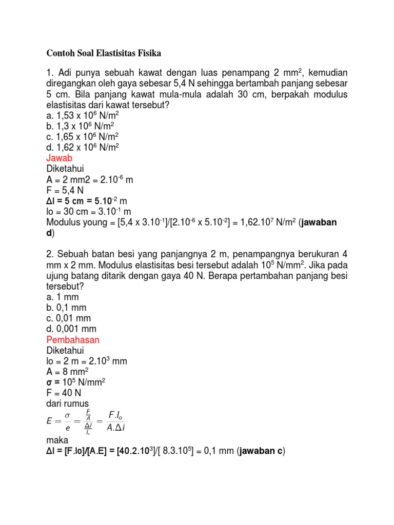 Contoh soal modulus elastisitas. Besarnya tegangan yang dilakukan pada sebuah batang adalah 2 x 10 6 nm 2. Sebuah pegas dalam keadaan tergantung bebas mempunyai panjang 10 cm. Modulus young kali ini merupakan pembahasan mengenai modulus youngmodulus ini ada kaitannya dengan gaya elastis mungkin sahabat masih ingat dengan gaya elastis. Sebuah pegas memiliki panjang 20 cm. Tali nilon berdiameter 2 mm ditarik dengan gaya 100 newton. Kita dapat menggunakan persamaan 3 untuk menyelesaikan soal ini.