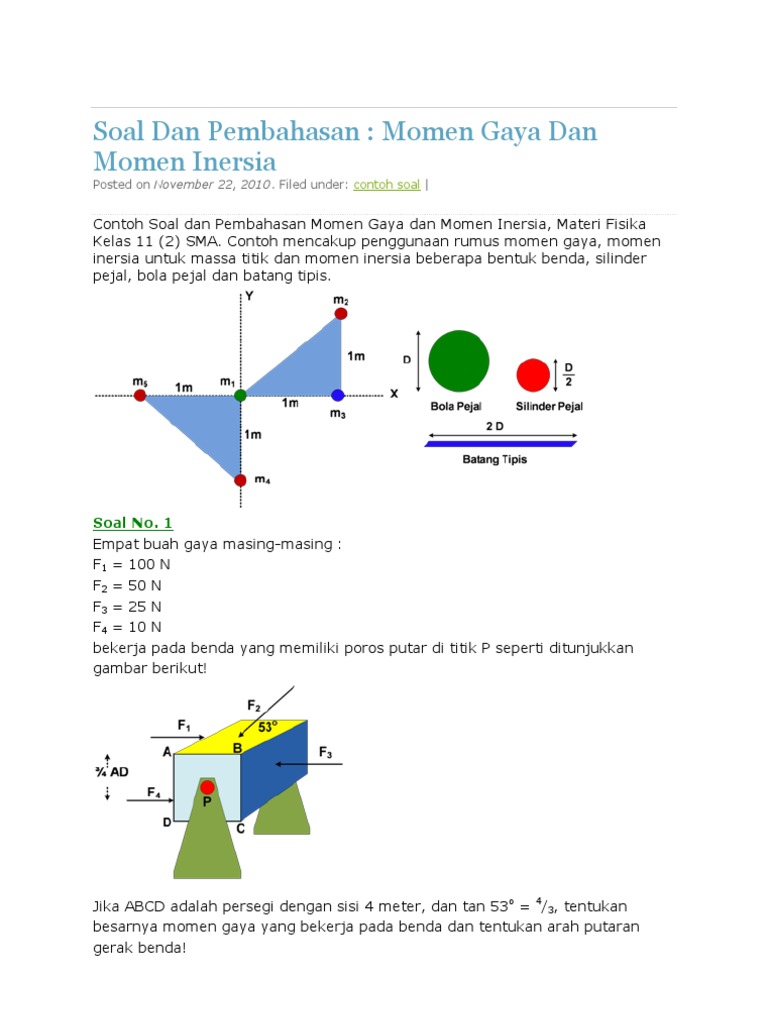 Contoh soal dan pembahasan momen gaya dan momen inersia materi fisika kelas 11 2 smacontoh mencakup penggunaan rumus momen gaya momen inersia untuk massa titik dan momen inersia beberapa bentuk benda silinder pejal bola pejal dan batang tipis. Empat buah partikel yang saling berhubungan dan membentuk satu sistem kesatuan dengan konfigurasi seperti gambar diatas.