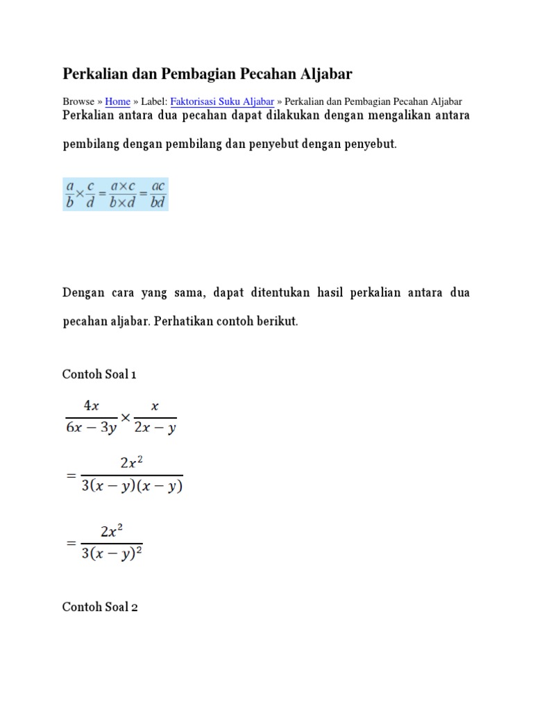 Contoh soal aljabar dan jawaban 1. Akan tetapi untuk lebih memudahkan memahami konsep ini anda harus paham dengan cara mencari faktor bentuk aljabar. Tentukan koefisien dari bentuk bentuk aljabar berikut. Baik itu ujian nasional ujian sekolah kuis atau pun yang lain. Operasi hitung pembagian pada aljabar biasanya keluar dalam soal ujian. Untuk menyelesaiakan pembagian pecahan bentuk aljabar caranya sama dengan menyelesaikan pembagian pecahan biasa yaitu dengan cara merubah ke bentuk perkalian dimana bilangan kedua dibalik penyebut menjadi pembilang dan pembilang menjadi penyebut.