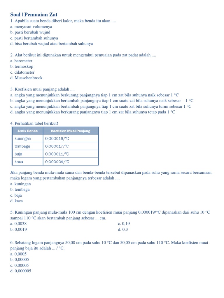 Selembar baja pada suhu 20 o c memiliki panjang 50 cm dan lebar 30 cm. Soal dan jawaban pemuaian smp kelas vii nomor 1 panjang sebatang alumunium pada suhu 0 oc adalah 2 meter. Selain itu kalian juga dapat menghitung koefisien muai luasnya. Jika koefisien muai panjang baja 10 5 o c 1 maka pertambahan luas dan luas total pada suhu 60 o c adalah. Pada suhu 100 oc luas lempeng alumunium adalah 2015 m2. Pemuaian dapat terjadi dalam tiga kondisi yaitu pemuaian panjang hanya dialami zat padat pemuaian luas hanya dialami zat padat dan pemuaian volume dialami zat padat cair dan gas.