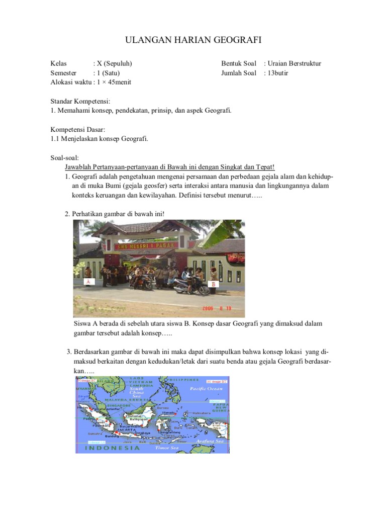 Contoh soal pendekatan geografi. Dalam pengkajian geografi kita mengenal tiga pendekatan utama yaitu sebagai berikut. Contoh soal pendekatan geografi dapat kita temukan di soal ujian nasional smama tahun 2012 pelajaran geografi soal nomor 3 banjir yang sering terjadi di sekitar pemukiman penduduk di daerah perkotaan akibat semakin dangkal dasar sungai. Pendekatan geografi dan contohnya ilmu geografi merupakan ilmu yang membahas mengenai gejala alam dan fenomena geosfer yang ada di muka bumipengertian geografi menurut para ahli juga meliputi hal hal yang berkaitan dengan kehidupan manusia dan alam sekitarnya serta interaksi antara makhluk hidup dengan lingkungannya. Soal pendekatan geografi dan cara menjawabnya by guru geografi 22 january jika tadi saya sudah jelaskan tentang cara menjawab soal konsep geografi kali ini saya akan coba membahas cara menjawab soal pendekatan geografi di ujian nasional geografi. Pendekatan spasial atau keruangan pendekatan ini menganalisis gejala atau fenomena geografis berdasarkan penyebarannya dalam ruang. Pendekatan geografi ilmu geografi adalah ilmu yang membahas tentang gejala alam dan fenomena geosfer yang terdapat di muka bumi.