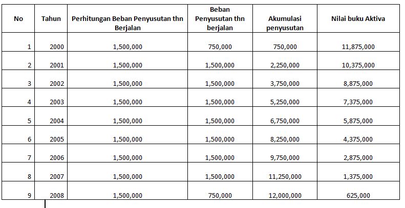 Dalam menilai penyusutan aktiva tetap metode penyusutan ini didasarkan pada berlalunya waktu jumlah penyusutan sama sepanjang masa manfaat cara perhitungan yang digunakan ialah. Dibeli sebuah bangunan pada tanggal 6 agustus 2000 dengan harga beli nilai perolehan sebesar 12m dengan masa manfaat selama 20 tahun. Contoh soal penyusutan aktiva tetap. Pt full colour membeli sebuah mesin untuk kegiatan operasional perusahaan seharga rp 5000000. Itulah tadi penjelasan mengenai metode penyusutan garis lurus dan beban menurun beserta contohnya.