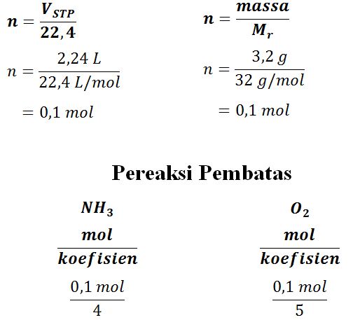 Amonia dapat dibuat melalui reaksi. Berikut ini adalah beberapa contoh soal untuk menghitung pereaksi pembatas.