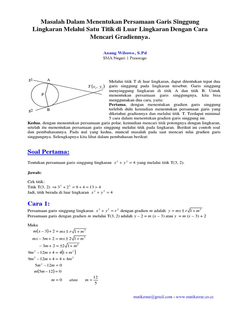 Bentuk soal un persamaan lingkaran dan soal un garis singgung lingkaran pada level ini berupa penerapan rumus pada bidang kehidupan. Jika sebelumnya rumushitung telah posting kemungkinan posisi garis terhadap suatu lingkaran kali ini kita akan belajar mengenai garis singgung lingkarangaris yang memotong lingkaran hanya pada satu titik itulah yang disebut garis singgung lingkaran. Contoh soal dan pembahasan tentang garis singgung lingkaran. Titik tertentu tersebut dinamakan pusat lingkaran dan jarak yang tetap tersebut dinamakan jari jari lingkaran. Tapi di sma materinya persamaan lingkaran yuk cek contoh soal dan pembahasannya. Hitung jari jari lingkaran dengan rumus sebagai berikut.