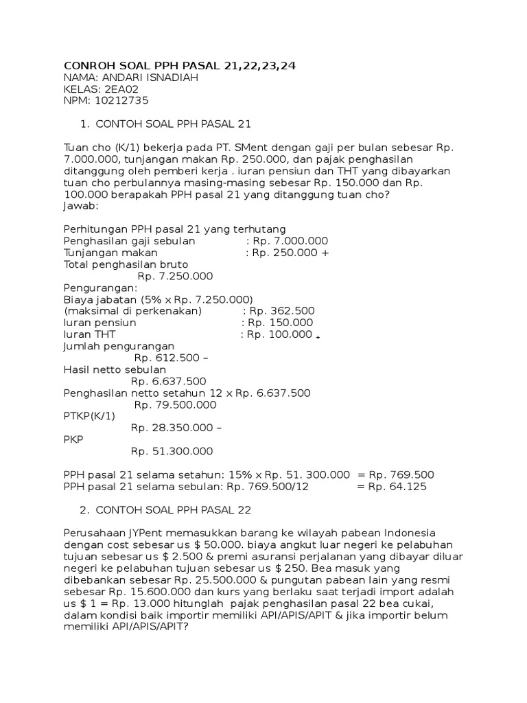 Contoh soal pph 24. Pada tahun 2013 data pt. Pph yang terutang angsuran pph pasal 25 rp12000000 rp9375000 rp262500000 contoh pemotongan dan penghitungan pph pasal 21 atas gaji karyawan. Pph pasal 29 yang harus dilunasi oleh kud a adalah sebesar. Hitung berapa pph pasal 21 terutang tahun 2008 dan tahun 2009 per tahun dan per bulannya. Contoh soal serta pembahasannya.