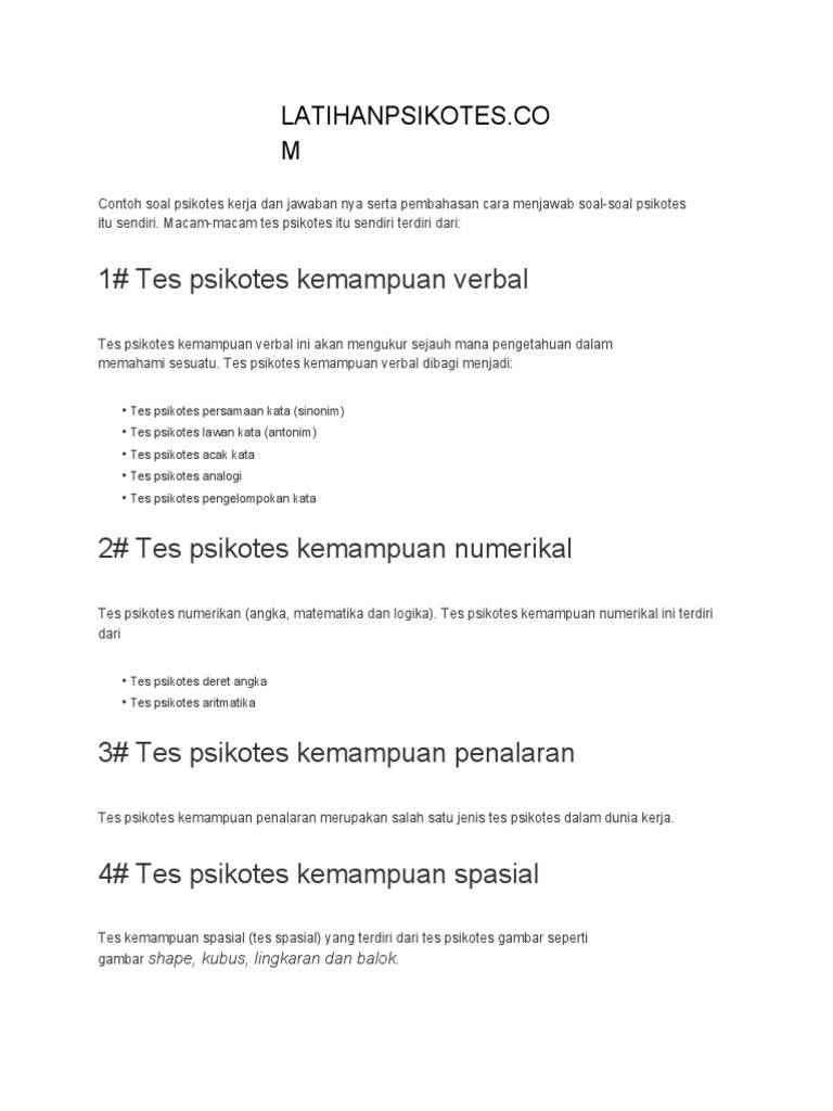 Read more contoh tes psikotespsikologi masuk smasmk smp sd favorit atau kelas unggulan 2020. Anda sudah tidak sabar ingin mengerjakan contoh soal psikotes matematika dari kami. Contoh soal kiat sukses dan kunci jawaban psikotes kerja artikel ini akan membahas 5 contoh soal psikotes kiat sukses dan kunci jawaban menghadapi tes psikotes saat melamar kerja. Psikotes bisa disebut juga sebagai tes psikologi yang memiliki beberapa definisi. Selamat belajar dan berlatih untuk menuju masa depan yang cerah tunggu edisi kami soal soal psikotes berikutnya untuk pembelajaran soal soal psikotes lainnya bisa dilihat disini. Ini contoh soal dan tips menjawab soal psikotest biar lulus tes seleksi kerja written by siti hadijah 29 april 2019 psikotes merupakan salah satu tahap seleksi kerja yang sering diterapkan oleh banyak perusahaan baik perusahaan besar atau jenis perusahaan yang masih masuk golongan startup.