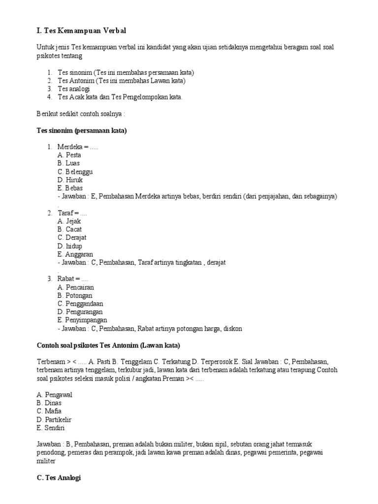 Contoh soal psikotes sinonim dan antonim dan jawabannya tersebut sudah dikemas dalam format pdf yang tentunya bisa anda buka pada berbagai macam perangkat digital mulai dari laptop komputer desktop sampai dengan smartphone atau ponsel pintar anda. Namun demikian kamu bisa download contoh soal psikotes antonim dan jawabannya pdf pada postingan ini. Psikotes memiliki banyak jenisnya diantaranya seperti psikotes verbal psikotes numerik matematika logika psikotes gambar. Contoh contoh soal di bawah yang akan kita bahas ini sudah termasuk didalamnya berbagai tes psikotes masuk kerja diantaranya. Soal soal psikotes kemampuan verbal. Untuk menjawab latihan soal psikotes lawan kata antonim ini sebenarnya tidak membutuhkan kalkulasi analisa seperti dalam pengerjaan soal psikotes gambar kemampuan spasial dan hanya perlu untuk mencari tahu arti kata tersebut dan mencari lawan kata dari kata tersebut.