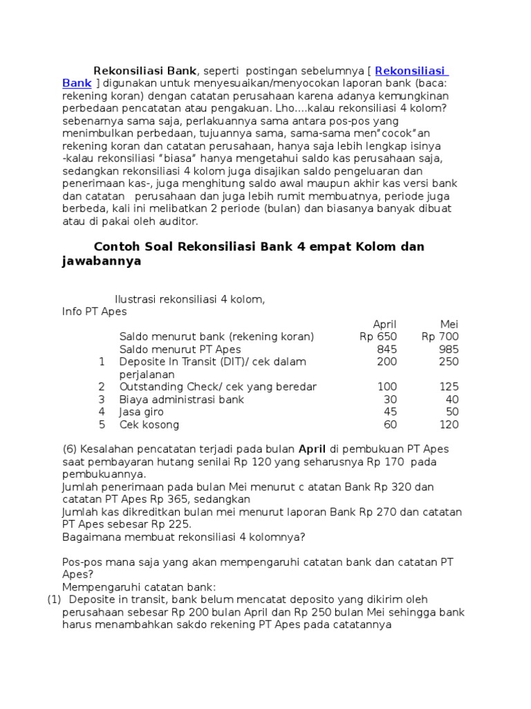 Ada 3 langkah untuk melakukan rekonsiliasi bank baik menggunakan metode rekonsiliasi bank 4 kolom maupun 8 kolom yaitu. Membuat perbandingan antara catatan kas perusahaan dengan laporan bank. Saldo menurut pt apes. Deposite in transit dit cek dalam perjalanan. Contoh soal rekonsiliasi bank dan jawabannya. Contoh soal dan penyelesaian rekonsiliasi bank 2 kolom pt adi jaya merupakan perusahaan yang bergerak dibidang perdagangan.
