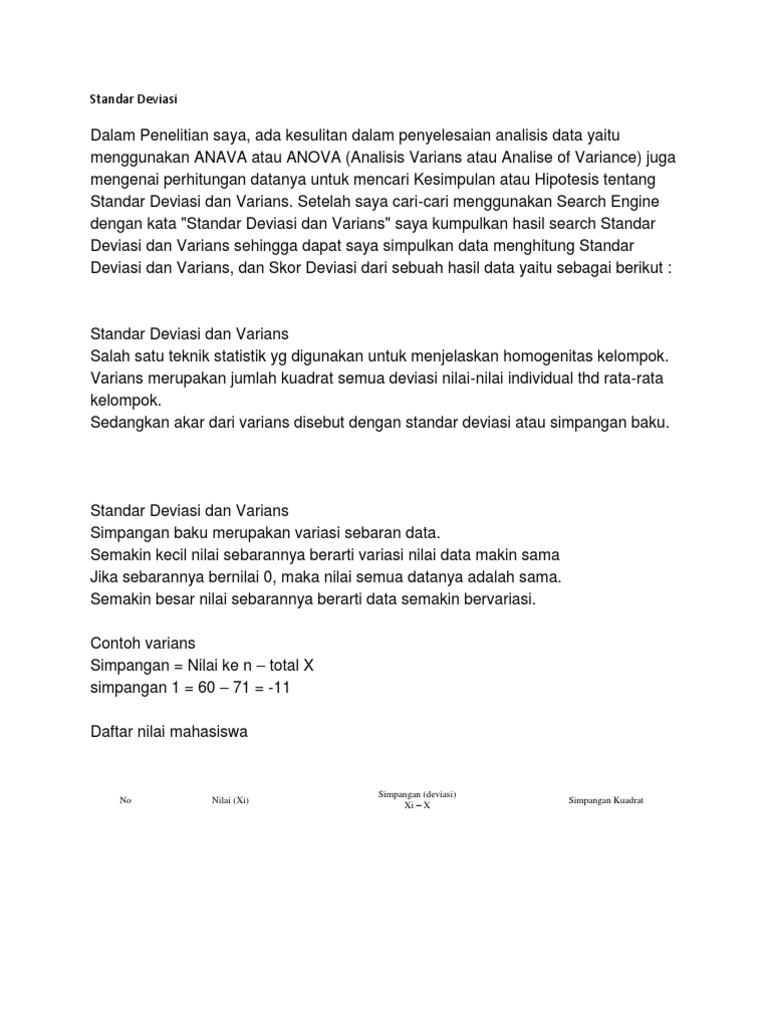 Contoh soal standar deviasi dan penyelesaiannya. Hal ini mungkin dikarenakan standar deviasi memiliki satuan ukuran yang sama saja dengan satuan ukuran dan data asalnya. Contoh soal distribusi normal iii 3. Data umur berbunga hari tanaman padi varietas pandan wangi adalah sbb. Inilah pembahasan lengkap terkait contoh soal varians dan standar deviasi. Standar deviasi merupakan ukuran dispersi yang paling banyak dipakai. Perlu di ingat bahwa b3b9 adalah cell dari data sampel yang di masukkan di exceljadi bukan merupakan rumus pasti maksudnya dia akan menyesuaikan bergantung pada data yang akan kita.