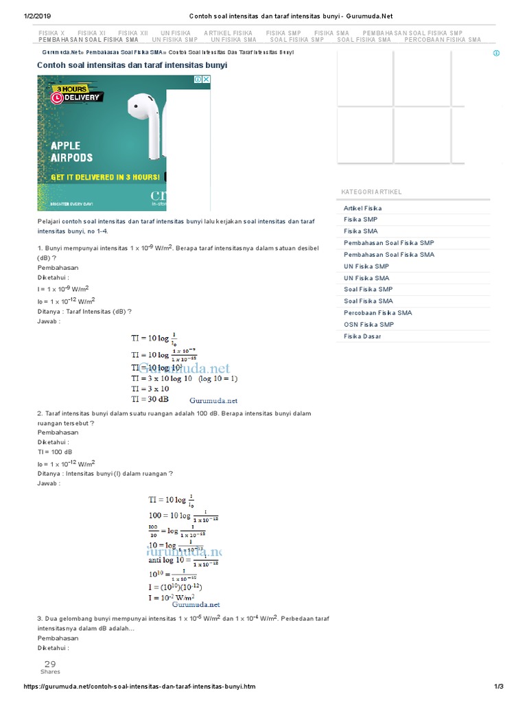 Contoh soal taraf intensitas bunyi. Pelajari contoh soal intensitas dan taraf intensitas bunyi lalu kerjakan soal intensitas dan taraf intensitas bunyi no 1 4. Suatu mesin menghasilkan bunyi dengan taraf intensitas bunyi sebesar 30 db. 6 x 10 9 wm 2 d. Contoh soal dua gelombang bunyi intensitasnya masing masing 10 watt dan 100 watt. 9 x 10 9 wm 2. Berapa taraf intensitasnya.