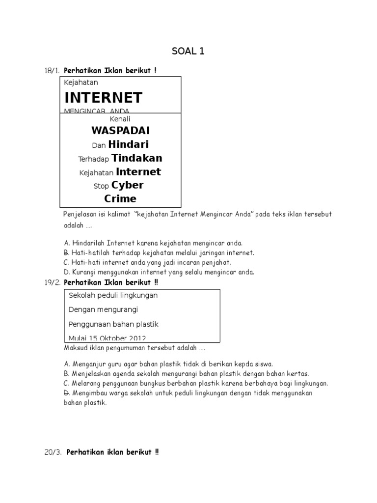 Berikut ini disajikan soal pilihan ganda tentang iklan atau contoh soal iklan baris beserta jawabannya. Itulah tadi kumpulan soal teks iklan pilihan ganda beserta jawaban kelas 12. Lihat juga contoh soal bahasa indonesia lainnya pada. Untuk meningkatkan disiplin menjaga kebersihan lingkungan. Bagi anda yang ingin mengetahui contoh soal teks narasi beserta jawabannya silahkan lihat link di bawah ini. Nah disini admin ingin memberikan contoh soal kepada sahabat sbi mengenai bahasa inggris yang terdiri dari 10 soal pilihan ganda beserta jawaban nya semangat untuk mencobanya ya sahabat sbi.