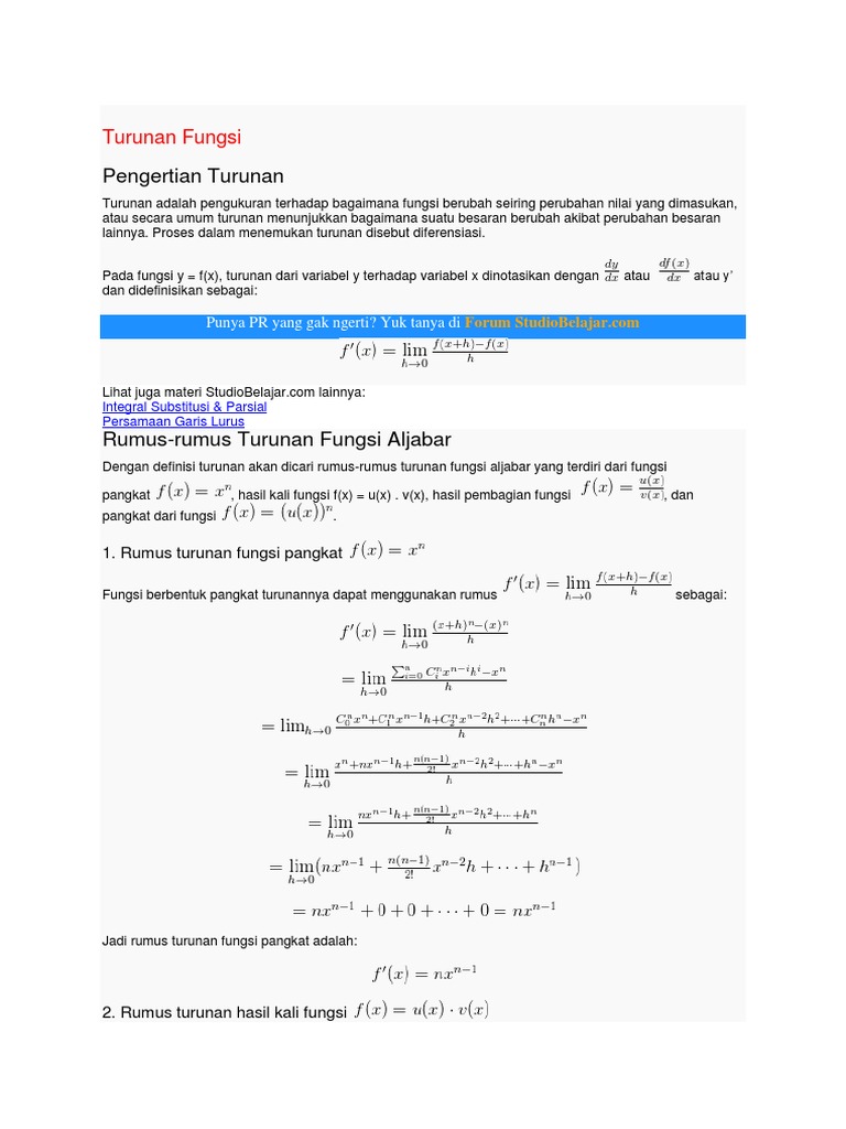 Siir isaac newton pada dasarnya konsep turunan sering sekali digunakan dalam kehidupan sehari hari baik dalam ilmu matematika atau ilmu yang lainnya. Pembahasan rumus turunan fungsi aljabar bentuk ax n. 1 tentukan turunan pertama dari fungsi berikut. B fx 2x 3 7x f x 6x 2 7. Mencari turunan fungsi aljabar bentuk pangkat. Turunan suatu turunan fungsi yang ditulis dengan notasi dengan rumus.