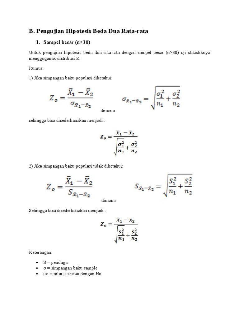 Rata rata hasil belajar matematika siswa yang menggunakan model pembelajaran kolaboratif lebih rendah dari atau sama dengan rata rata hasil belajar matematika siswa yang menggunakan metode pembelajaran konvensional. Prosedur pengujian hipotesisnya ialah sebagai berikut. Ujilah hipotesis pada taraf nyata 5 bahwa μ1 μ2 dgn alternatifnya μ1 μ2. Salah satu teknik analisis statistik untuk menguji hipotesis dua rata rata. Pengujian hipotesis beda dua rata rata dalam praktek seringkali kita ingin mengetahui apakah ada perbedaan yang berarti dari dua rata rata. Kurniawan agung resmanto 2015 21 045 uji hipotesis dua rata rata digunakan untuk mengetahui ada atau tidak adanya perbedaan kesamaan rata antara dua buah data.