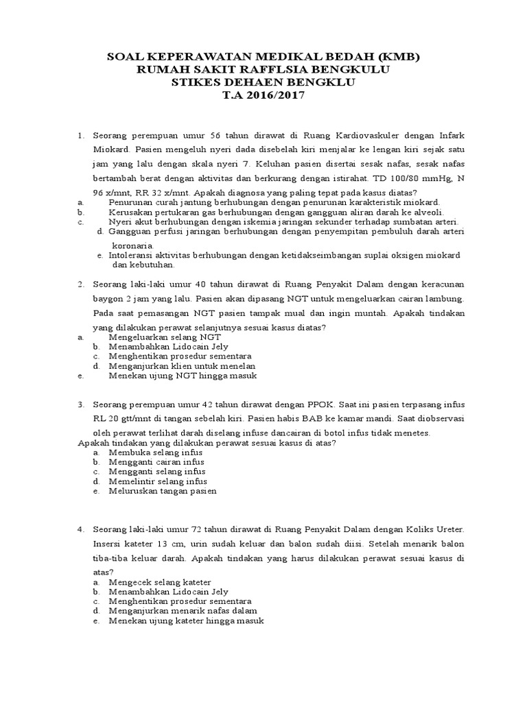 Contoh soal uji kompetensi keperawatan medikal bedah. Klien mengatakan pada perawat bahwa ia akan memilih obat herbal untuk membantu menurunkan tekanan darahnya. Contoh soal uji kompetensi keperawatan medikal bedah kmb edisi 1 nursing professional hai sobat semuanya bertemu lagi dengan kami kali ini kami akan membagikan contoh soal uji kompetensi ukom keperawatan kmb beserta kunci jawabannya dibawah ini. Guru sd smp sma contoh soal uji kompetensi keperawatan medikal bedah pdf. Dibawah ini merupakan soal uji kompetensi keperawatan medikal bedah kmb disertai kunci jawaban 1. Guru sd smp sma contoh soal uji kompetensi keperawatan medikal bedah. Apakah pendidikan kesehatan yang sebaiknya diberikan oleh perawat sebelum pasien pulang.
