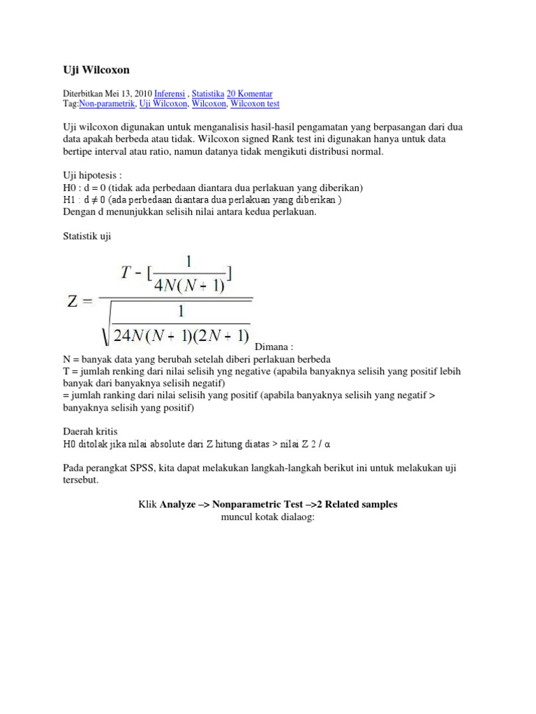 Uji beda dua sampel berpasangan wilcoxon ranking bertanda wilcoxon banyak digunakan untuk menguji perbedaan perlakuan yang diberikan kepada objek penelitian dengan mempertimbangkan arah dan magnitude relatif perbedaan dari dua sampel berpsangan. Hal ini tidaklah salah sebab jika data penelitian anda tidak berdistribusi normal melalui uji normalitas maka data tersebut dianggap tidak memenuhi syarat dalam pengujian statistik parametrik khususnya uji paired sample t test. Tidak terdapat perbedaan produktivitas kerja pegawai sebelum dan sesudah memakai ac. Uji wilcoxon ini hampir sama dengan uji tanda tetapi besarnya selisih nilai angka antara positif dan negatif diperhitungkan dan digunakan untuk menguji hipotesis komparatif 2 sampel berpasangan.