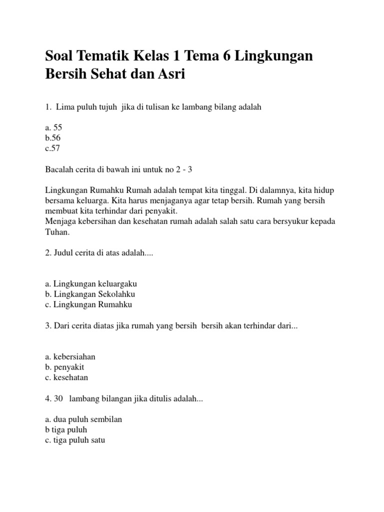 Semoga kumpulan soal ptsuts tema 6 kelas 6 semester 2 ini dapat dijadikan referensi belajar khususnya adik adik kelas 6 sebagai bekal untuk menghadapi utspts penilaian tengah semester 2. Berikut kami bagikan kumpulan soal tematik kelas 1 sekolah dasar sd lengkap tema 1 2 3 4 5 6 7 8 kurikulum 2013.