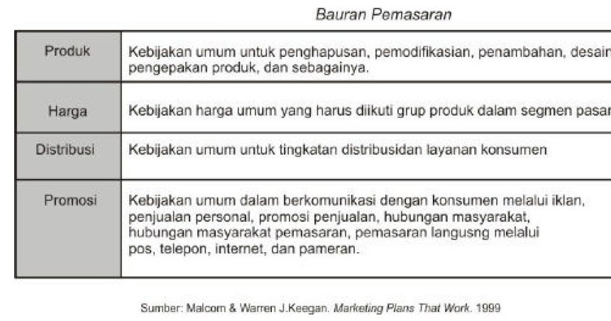 Mengembangkan strategi pemasaran dan bauran pemasaran terintegrasi setelah strategi pemasaran ditetapkan maka perusahaan diharapkan untuk menerapkan dan merencanakan rincian bauran pemasaran marketing mix merupakan kumpulan alat pemasaran taktis terkendali produk harga tempat dan promosi yang dipadukan perusahaan untuk menghasilkan respons yang diinginkan di pasar sasaran. Strategi pemasaran 4p merupakan kumpulan alat pemasaran taktis yang terdiri dari product produk price harga place tepat dan promotion promosi yang dipadukan agar menghasilkan respon yang diinginkan di pasar. Strategi inilah nantinya yang akan dijadikan patokan awal dalam menjalankan sebuah bisnis agar bisa berkembang. Pengertian marketing mixbauran pemasaran 4p dan 7p marketing mix marketing mix atau bauran pemasaran adalah strategi yang digunakan oleh perusahaan untuk merumuskan penawaran produk atau layanan bagi pelanggannya dengan memadukan elemen elemen pemasaran seperti produklayanan product tempat place harga price dan promosi promotion yang biasanya disingkat dengan 4p marketing mix. Terkhusus bagi anda yang baru mau terjun ke dalam dunia bisnis nampaknya anda perlu tahu dulu apa itu strategi pemasaran 4p. Seperti kita ketahui bersama.