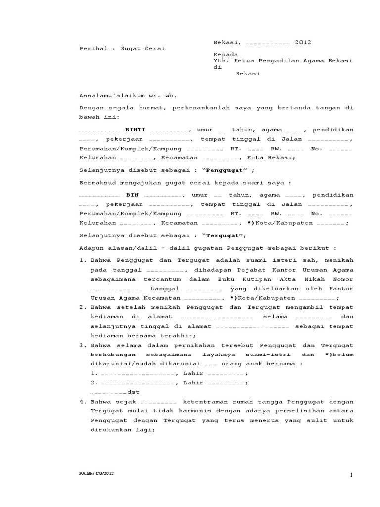 Namun apabila terjadi masalah rumah tangga yang tidak memungkinkan lagi bertahan biasanya istri atau suami akan menggugat cerai. Contoh blangko cerai gugat. Contoh surat gugatan cerai. Bersama ini saya siti fatonah agama islam umur 35 tahun pekerjaan swasta beralamat di jl. Sonia qori rosida binti syaifuddin. Di dalamnya biasanya terdapat nama tempat dan tanggal lahir usia alamat dan sebagainya.