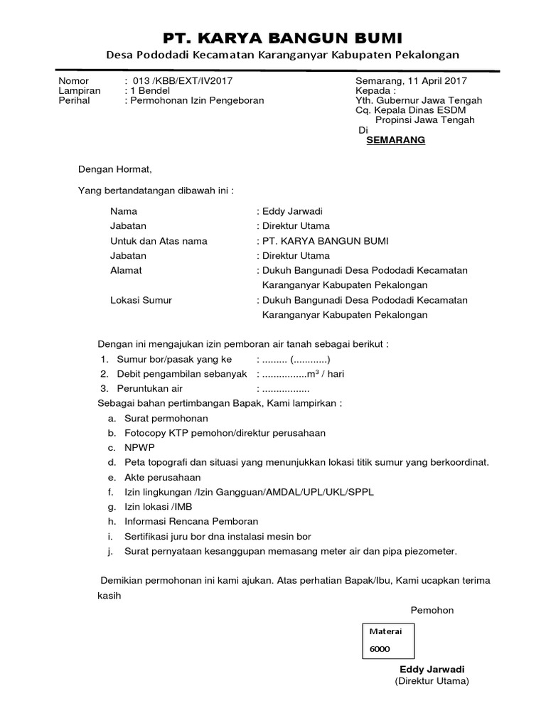 Penilaian anda sangat berguna untuk meningkatkan kualitas konten kami. Contoh surat permohonan pengeboran air tanah jasa tukang sumur bor tangerang 081311327533 contoh surat permohonan pengeboran air tanah. Ketentuan pengambilan air tanah adalah setiap kegiatan pengambilan air tanah yang dilakukan dengan cara penggalianpantek atau pengeboran untuk dimanfaatkan airnya dan untuk tujuan lain. Contoh surat izin pengusahaan air tanah sipa yang diterbitkan oleh dpmptsp provinsi banten. Berikut informasi sepenuhnya tentang contoh surat permohonan izin pengeboran air tanah. Contoh permohonan surat keterangan ketidak tersediaan air bersih air minum ke pdam surat kuasa.