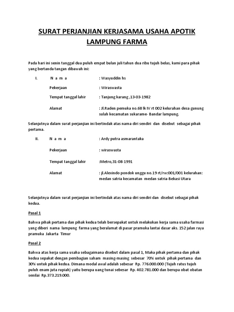 Kapan mou ini mulai berlaku serta tanggal berakhirnya. Adapun agar hubungan bisnis dari kedua belah pihak tersebut tetap berjalan dengan baik dan lancar maka alangkah baiknya apabila. Namun untuk mengesahkan perjanjian kerjsama yang dijalani maka kedua belah pihak sebaiknya tetap menggunakan surat perjanjian kerjasama. Surat perjanjian kerjasama usaha bersama contoh surat perjanjian kerjasama usaha bersama ini dibuat dan disepakati oleh pihak pihak yang ingin melakukan kerjasama dibidang usaha tertentu dimana sistem pembagian keuntungannya berdasarkan bagi hasil sehingga sesuai dengan syariat islam. Contoh surat perjanjian kerjasama usaha bisnis. Kerjasama tersebut bisa dilakukan oleh dua orang atau dua pihak bahkan juga lebih.