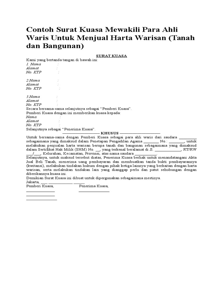 Surat pernyataan ahli waris diperlukan sebagai bukti pemberian kuasa kepada salah satu ahli waris untuk menjual rumah atau tanah hasil warisan. 10 kelurahan asam manis kecamatan melodi indah kota bandung. Jika anda tidak memiliki kesempatan untuk merawat dan menjaga tanah tersebut maka anda bisa memberikan kuasa kepada orang lain. 15 contoh surat kuasa tanah untuk berbagai keperluan setiap harta benda tentu memiliki harga tersendiri yang harus kita jaga. Adapun contoh surat kuasa tanah antara lain sebagai berikut. Secara umum contoh surat pernyataan ahli waris dibuat untuk proses jual beli tanah warisan memang sama dengan proses jual beli tanah dan rumah seperti biasanya.
