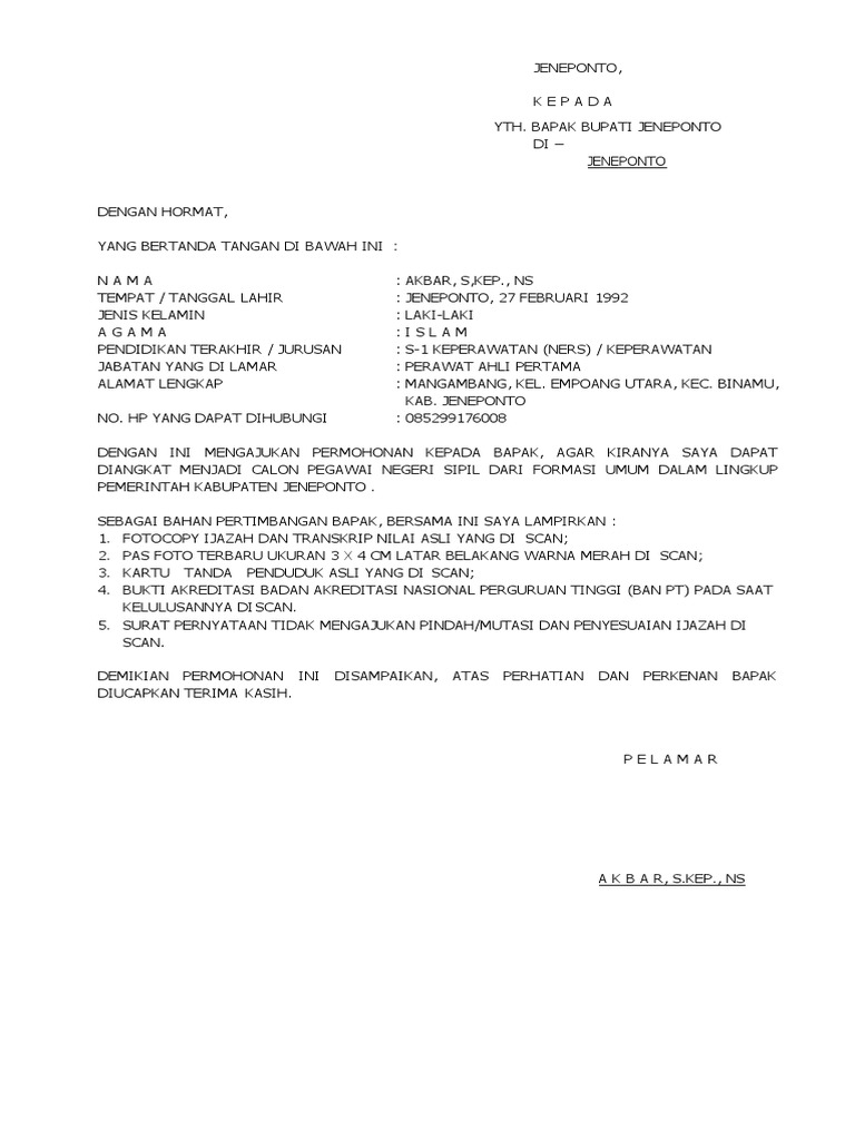 Contoh surat lamaran cpns umum. Contoh surat lamaran kerja cpns terbaru 2015 buat anda yang ingin melamar kerja di cpns maka membuat surat lamaran tidak boleh asal buat saja dan ada setruktur yang harus anda ketahui juga maka dengan ini kami blog contoh surat dan proposal memberikan info ini buat anda semua supaya anda bisa di terima lamaran kerja cpns anda nantinya. Namun untuk lebih jelasnya saya juga akan membagikan contoh surat lamaran cpns 2018. Gunakan bahasa resmi pastikan setiap melamar pekerjaan gunakan format surat bisnis yang resmi. Download contoh surat lamaran kerja internasional word. Contoh surat lamaran cpns tidak lama lagi pendaftaran cpns akan segera dibuka. Tirtoid pendaftaran cpns 2019 kemendikbud formasi lulusan sma yang telah dibuka pada 13 27 november 2019 mewajibkan pelamar mengunggah dokumen surat lamaran dan pernyataan ke portal sscasn bkn.