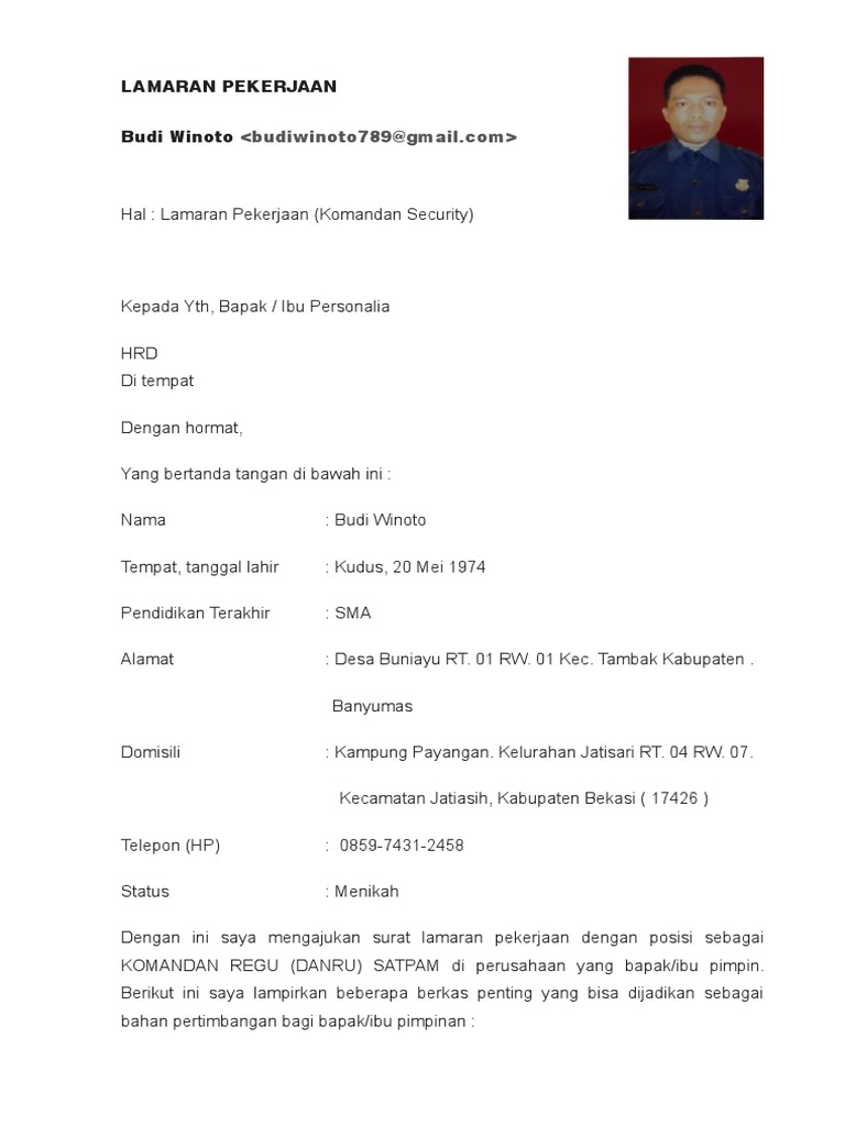 15 contoh surat lamaran kerja satpam security atau penjaga di perumahan hotel kantor dan pertokoan surat lamaran kerja desember 07 2019 1424 contoh surat lamaran kerja satpam di era yang sudah serba teknologi dengan adanya internet pada saat ini anda bisa dengan mudah menemukan informasi mengenai lowongan kerja. Contoh surat lamaran kerja di perusahaan seringkali dicari oleh para pencari kerja yang ingin mengajukan lamaran pekerjaan di perusahaan perusahaan yang ada di indonesia. Contoh surat lamaran kerja pada kesempatan kali ini kita akan membahas tentang contoh surat lamaran kerja security. Contoh surat lamaran kerja pada artikel ini kita akan membahas contoh surat lamaran pekerjaan yang dapat kamu dapatkan beserta file doc nya. Mungkin terdapat jutaan artikel di internet yang menyediakan panduan bagaimana cara membuat surat lamaran pekerjaan yang disertai contoh surat lamaran pekerjaan baik itu surat lamaran kerja untuk melamar ke perusahaan maupun surat lamaran pekerjaan. Contoh surat lamaran kerja security satpam yang baik di perlukan jikalau anda mau menjadi seorang keamanan dalam berbagai bentuk perusahaan seperti pt bank perumahan dan juga masih banyak lainya yang tentunya memerlkan jasa pengamanan yang baik.