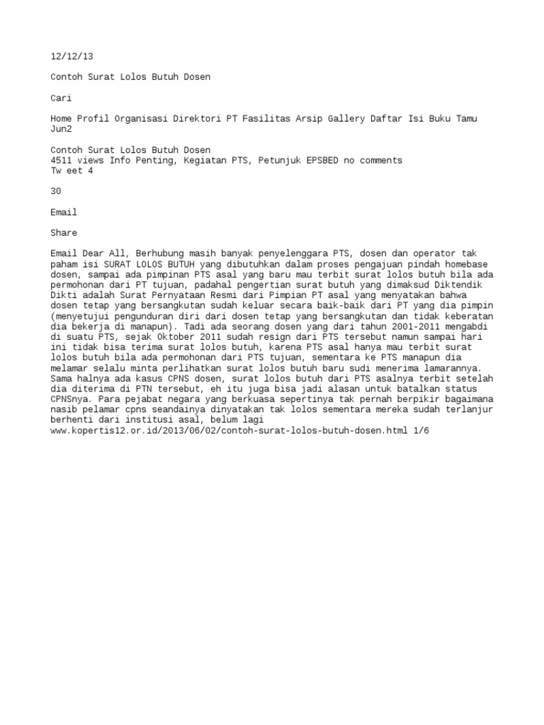 Surat lolos butuh pengertian yang dimaksud diktendik dikti adalah surat pernyataan resmi dari pimpian pt asal yang menyatakan bahwa dosen tetap yang bersangkutan sudah keluar secara baik baik dari pt yang dia pimpin menyetujui pengunduran diri dari dosen tetap yang bersangkutan dan tidak. Search the worlds information including webpages images videos and more. Tadi ada seorang dosen yang dari tahun 2001 2011 mengabdi di suatu pts sejak oktober 2011 sudah resign dari pts tersebut namun sampai hari ini tidak bisa terima surat lolos butuh karena pts asal hanya mau terbit surat lolos butuh bila ada permohonan dari pts tujuan sementara ke pts manapun dia melamar selalu minta perlihatkan surat lolos butuh baru sudi menerima lamarannya. Contoh surat lolos butuh pns. Tadi ada seorang dosen yang dari tahun 2001 2011 mengabdi di suatu pts sejak oktober 2011 sudah resign dari pts tersebut namun sampai hari ini tidak bisa terima surat lolos butuh karena pts asal hanya mau terbit surat lolos butuh bila ada permohonan dari pts tujuan sementara ke pts manapun dia melamar selalu minta perlihatkan surat lolos butuh baru sudi menerima lamarannya. Pengalaman membuat visa korea selatan sangatlah mudah asalkan pers.