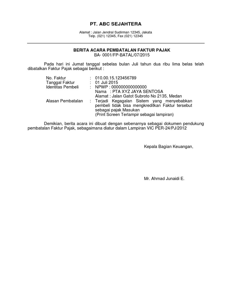 Contoh surat pembatalan faktur pajak. Buat anda yang penasaran mari simak ulasan di bawah ini. Syarat pembatalan faktur pajak sebelum ada e faktur. Boleh minta contoh surat pembatalan faktur pajak versi e faktur tolong dikirim ke soalnya si wapu tidak mau menerima fp pengganti beda tanggal thx sebelumnya chw newbie location. Nota pembatalan mengurangi pajak keluaran penjual barang pemberi jasa pada masa diterbitkan sebaliknya bagi pihak pembeli penerbitan nota pembatalan faktur pajak mengurangi pajak masukan. Sehingga disini kami akan memberitahukan contoh surat pembatalan faktur pajak. Pajak tempat pengusaha kena pajak penjual dikukuhkan dan ke kantor pelayanan pajak tempat pengusaha kena pajak pembeli dikukuhkan maksud surat pemberitahuan ini apa.