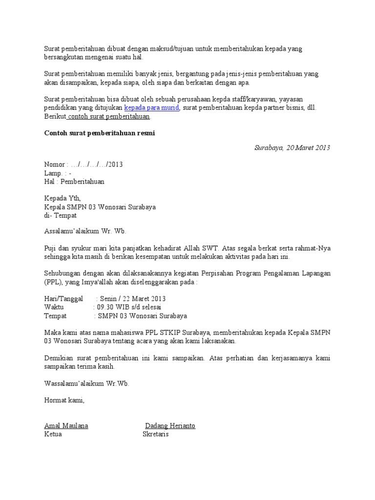 Tentunya format pembuatannyapun harus diperhatikan dengan baik sehingga dapat membuatnya dengan benar. Dan untuk lebih memperlancar jalannya kegiatan maka biasanya dibuatlah surat. Surat pemberitahuan secara resmi bertujuan untuk memberitahu pihak tertentu tentang adanya suatu kegiatan di waktu yang akan datangsurat pemberitahuan secara resmiini biasanya dikeluarkan oleh berbagai jenis instansimulai dari instansi pendidikan sekolahan hingga perguruan tinggi instansi pemerintahan bahkan suatu perusahaan. Kumpulan contoh surat bisnis surat dinas surat izin surat kuasa surat lamaran kerja surat pemberitahuan surat penawaran surat pengunduran diri surat. Berikut ini ada beberapa macam contoh surat pemberitahuan resmi sesuai dengan. Contoh surat pemberitahuan setiap instansi sekolah pemerintah desa pemerintah daerah kabupaten pemerintah pusat organisasi komunitas perusahaan instansi pemerintah dan lembaga negara selalu melakukan kegiatan surat menyurat.