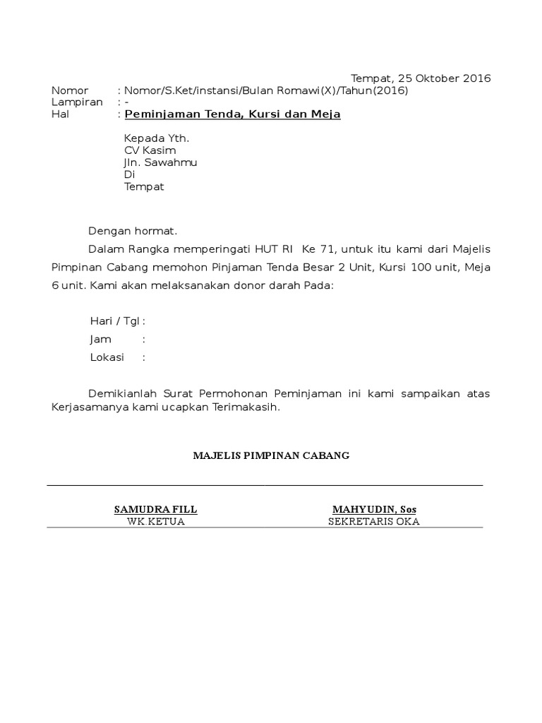 Surat peminjaman tempat contoh surat peminjaman gedung tempat kegiatan pinjam pakai alat kartika bluesky september 19 2019 contoh surat no comments makalahid bagi yang sering menjadi panitia di sebuah event atau bekerja dalam bidang persuratan tak asing dengan surat peminjaman tempat. Bapak ketua rw 60 di tempat. 42112144 sma xii 2011. 1 februari 2019 pukul 812 am terima kasih atas share ilmunya suka suka. Contoh surat peminjaman standtenda. The collection that comprising chosen picture and the best amongst others.