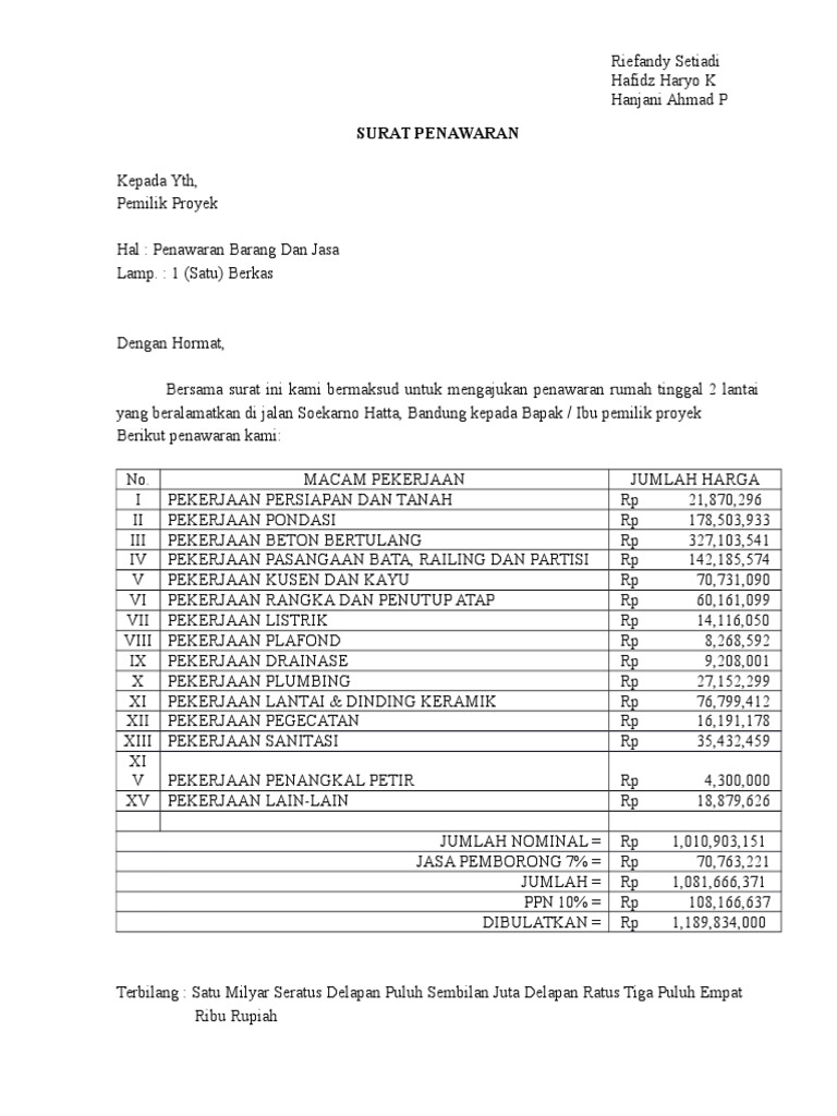 Adapun surat yang dipergunakan oleh suatu perusahaan atau instansi merupakan jenis jenis surat resmi dimana penulisannya harus sesuai dengan kaidah kaidah penulisan surat resmi dan penggunaan bahasa yang baik serta sesuai dengan. Jika kamu sedang membutuhkan contoh surat penawaran harga proyek kami akan berikan format surat penawaran sebagai referensi. Contoh surat penawaran harga proyek ini bisa digunakan dalam mengikuti tender lelang proyek pemerintah maupun swasta surat yang bagus akan menggambarkan keseriusan dalam mengikuti lelang sekaligus memberikan citra positif bagi perusahaan yang melakukan penawaran harga tidak ada standar resmi untuk surat ini jadi masing masing perusahaan dapat berkreatifitas untuk membuat yang terbaik. Contoh surat penawaran harga proyek rumah tinggal. Demikianlah 2 contoh surat kontrak perjanjian pembangunanuntuk mendapatkan contoh lain bentuk surat perjanjian yang sesuai dengan kebutuhan anda silahkan lihat kumpulan contoh surat perjanjian kami yang lain dalam kategori surat perjanjian. Imanaku daeng di tempat dengan hormat sehubungan dengan adanya pekerjaan pemagaran panel beton di lokasi lahan desa ciseeng bogor yang bapak miliki maka kami ajukan penawaran harga dengan hargam1 rp.